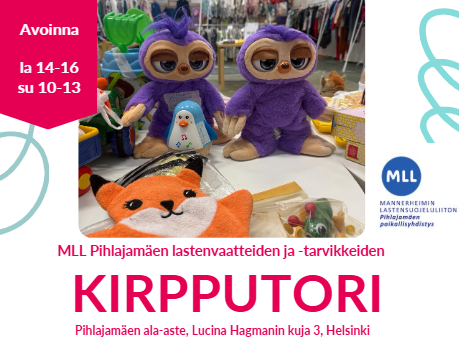 Seuraava kirpputori on 14.-15.3.2026 Pihlajamäen ala-asteella. Kirpputori on avoinna lauantaina klo 14-16 ja sunnuntaina klo 10-13.