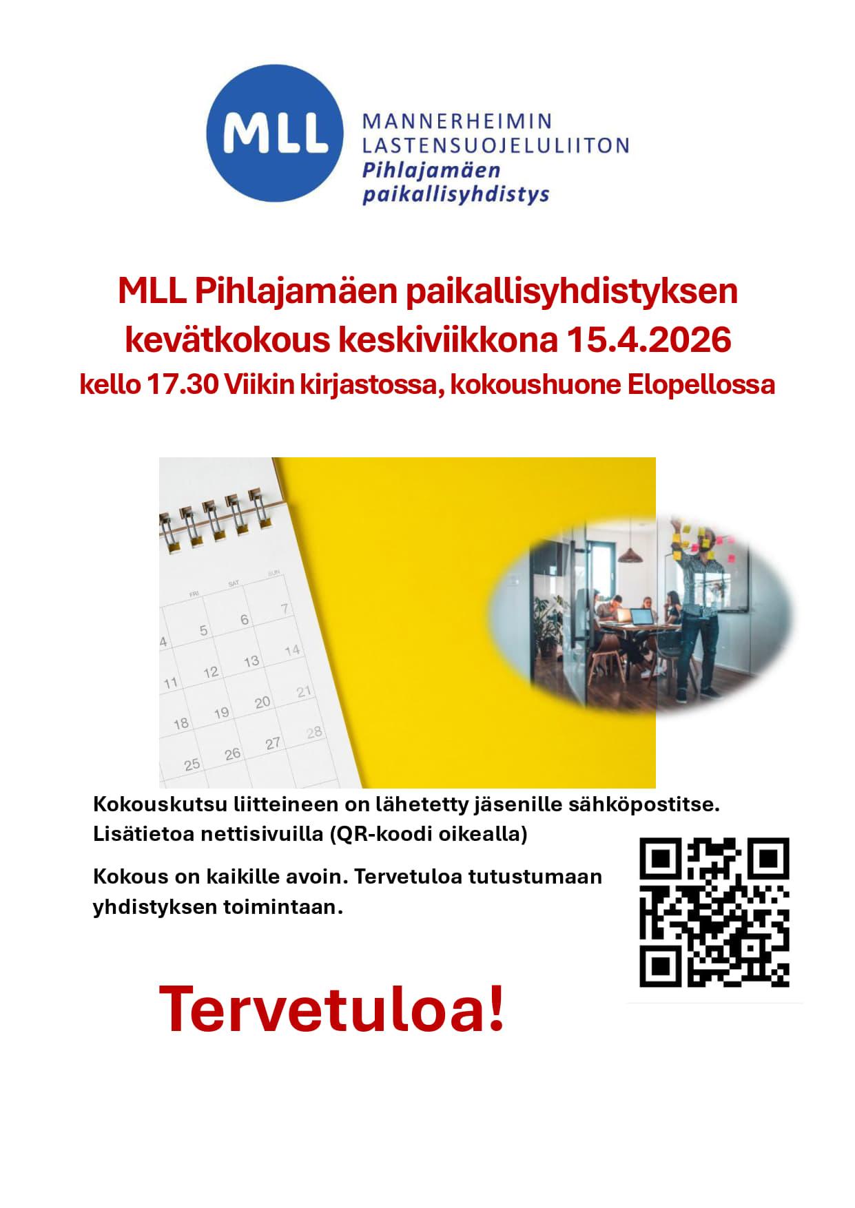 Kevätkokouksessa käsitellään edellisen vuoden tilinpäätös ja toimintakertomus, valitaan edustajat piirin ja liiton kokouksiin. Sääntömääräiseen kokoukseen kaikki ovat tervetulleita tutustumaan yhdistyksemme toimintaan. (Vain MLL Pihlajamäen jäsenillä äänioikeus)