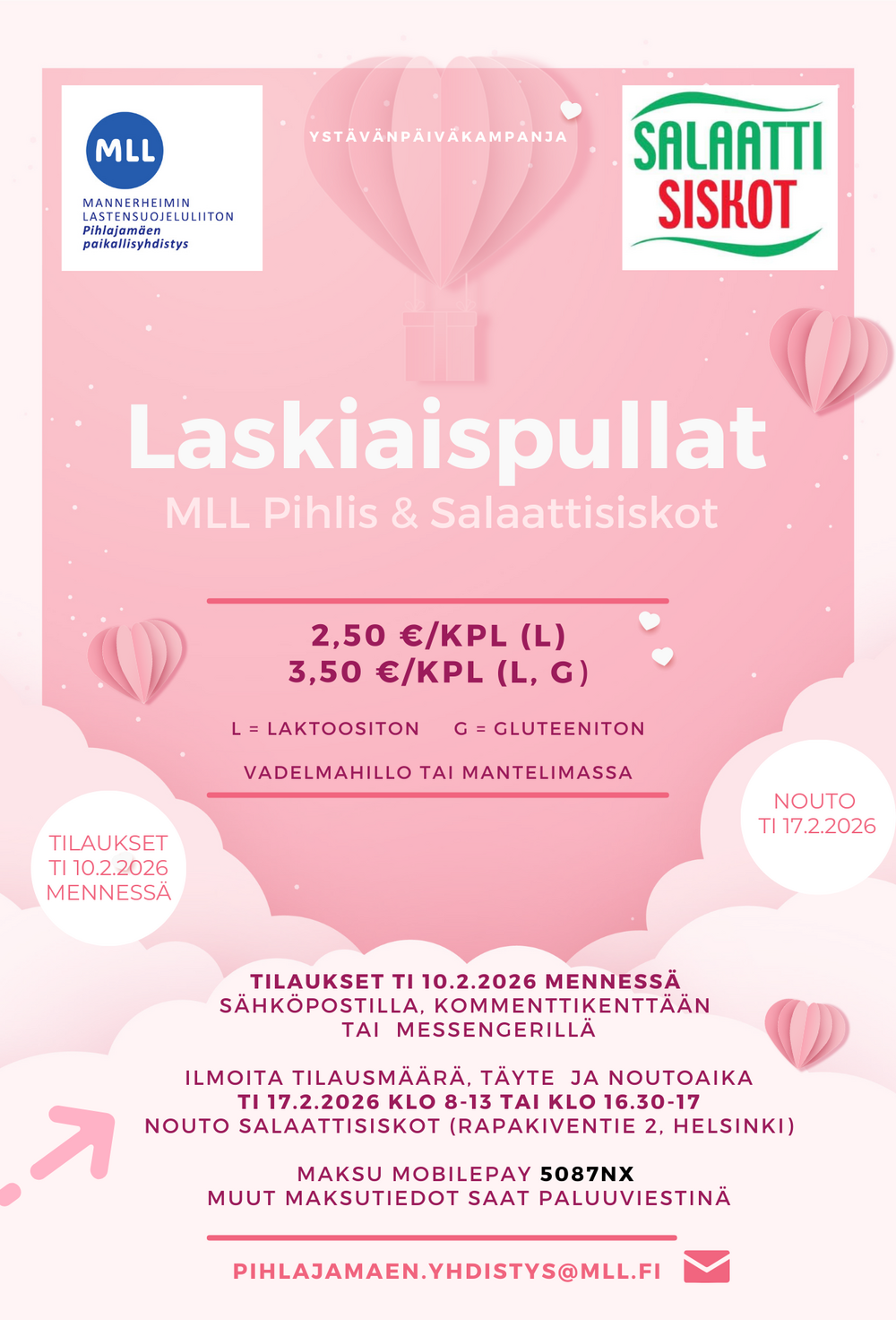 Tilaukset 10.2.2026 mennessä sähköpostilla pihlajamaen.yhdistys@mll.fi.